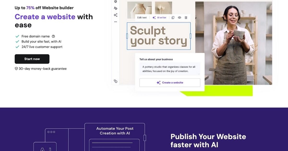 Hostinger’s Website Builder is a browser-based, no- builder packed into a hosting plan. You describe your business or project, and the AI generates a full site: pages, structure, and draft text in about a minute. From there, you can edit everything using a drag-and-drop interface that’s simple but not restrictive. The editor uses a smart grid layout with some flexibility, which avoids the typical mess you get from too much freedom. There are around 150 templates to choose from, covering everything from portfolios to online stores. All of them are mobile responsive out of the box. Where the AI tools get useful: you get an SEO assistant, image generator, logo maker, blog content generator, and AI writer. These aren’t gimmicks. They actually help speed up the build process, especially if you’re launching solo or without a team. The ecommerce tools cover the basics: product listings, galleries, Stripe and PayPal payments, and inventory tracking. You can even generate product descriptions just by uploading images. It won’t replace Shopify for large stores, but it’s more than enough for a basic product catalog. Everything runs on Hostinger’s hosting infrastructure. SSL is included. So is a free domain on most paid plans. Site backups, analytics, and live chat support are part of the package. No need to juggle different platforms. This is for people who want a site live in hours, not weeks. Ideal for freelancers, small businesses, and anyone who doesn’t want to touch WordPress.