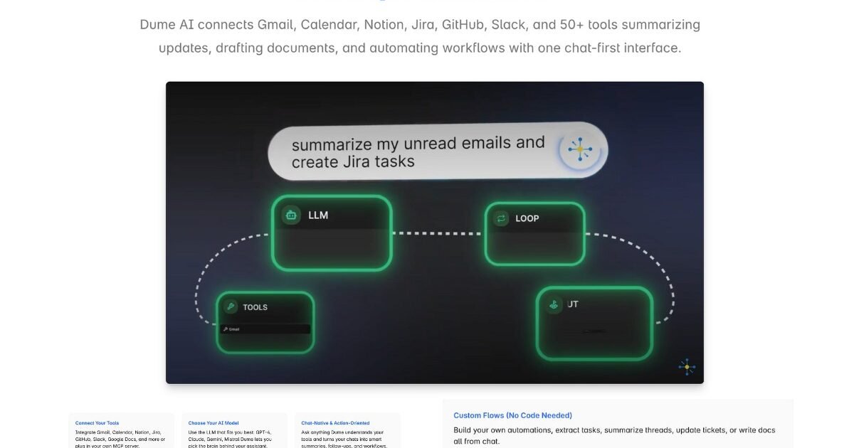 Dume. ai pulls together your digital tools—Gmail, Slack, Notion, Jira, GitHub—into a single interface that works like a smart assistant. Instead of toggling between tabs or digging through dashboards, you can handle tasks, ask for updates, or trigger workflows directly through a chat window. It’s built for people who spend more time managing tools than doing actual work: product leads, startup teams, remote workers drowning in notifications. The goal is simple: cut down on context switching and let the machine handle the tedious bits.