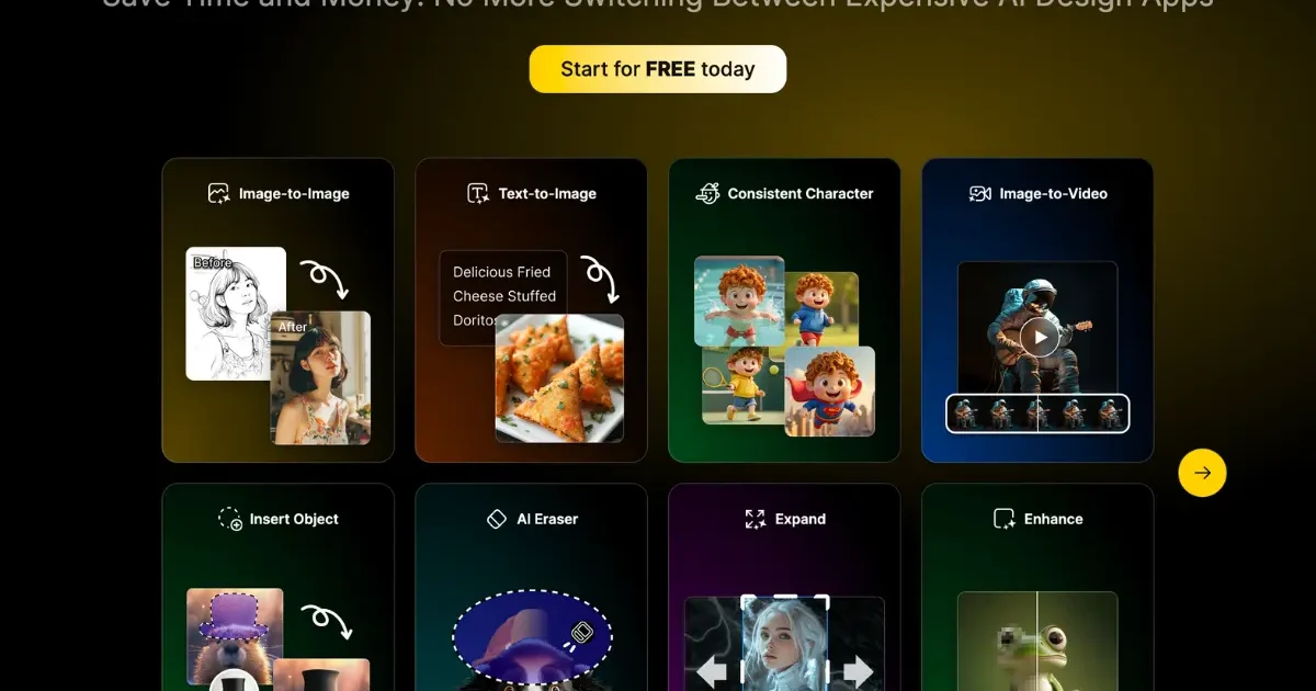 Text-to-image and image-to-image generation Layer-based canvas composition with drag-and-drop positioning Generative Fill for editing specific areas via text instruction Remove Object tool for cleaning unwanted elements from photos Background removal with one-click simplification Face Swap and avatar generation AI Photo Filter for cartoon and style conversion 2D-to-3D image converter Auto-selection tool to extract objects as separate layers AI Photo Enhancer for clarity and artifact fixing Sketch-to-art conversion Consistent character generation across multiple images Built-in GPT-assisted prompt generation Predefined style library for easy customization Export up to 6144×6144 pixels in high resolution AI text effects and logo design tools
