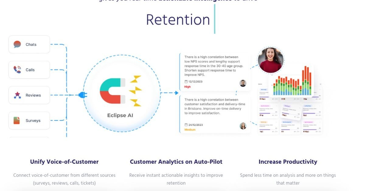 Eclipse AI takes the guesswork out of understanding and retaining your customers by merging chat, surveys, audio/video calls, emails, and online reviews into one platform. Exclipse allows you to create unique surveys or integrate existing surveys. Get actionable insights that highlight areas of improvement and boost your Customer Experience KPIs. Focus on executing strategies that matter instead of manual data analysis. Questions that Eclipse AI can answer for you: What are the top reasons why customers are churning? What are the most common pain points that customers are experiencing? What are the best ways to improve the customer experience? What are the most effective ways to retain customers? How it works: Listen: Connect and amalgamate your omnichannel voice-of-customer data. Understand: Identify real-time trends and warning signs that affect customer retention. Act: Receive AI-assisted insights that lead to increased customer retention.