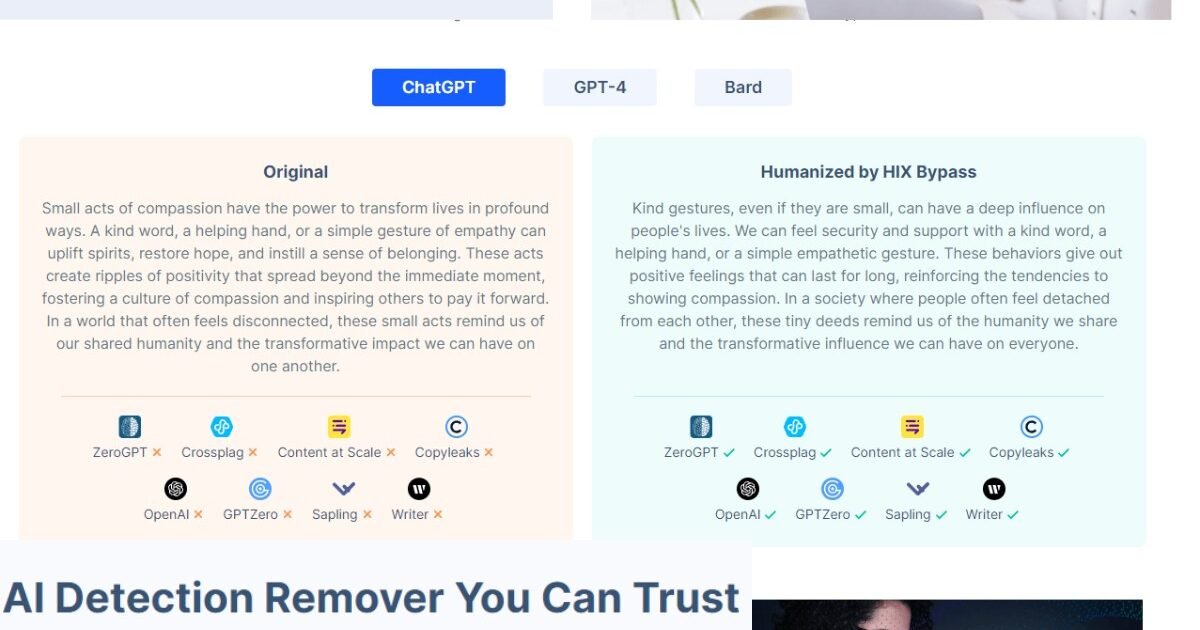 With HIX Bypass transforms your AI-generated text into undetectable, human-like content in just one click. This tool makes AI-generated text read like it was written by a human and pass common AI detection tests. It works with content from ChatGPT, GPT-4, Gemini, Claude, and similar models, restructuring the text so it scores highly on “human-written” ratings from detectors like GPTZero, Originality. AI, Turnitin, and Sapling. Instead of swapping a few words or rearranging sentences, HIX Bypass applies natural language processing and large language models trained on millions of human-written samples. This allows it to change sentence rhythm, vocabulary, and phrasing while preserving the original meaning. It supports over 50 languages, can check the likelihood of detection before you publish, and includes modes for different rewrite strengths, which is useful when balancing speed and thoroughness.