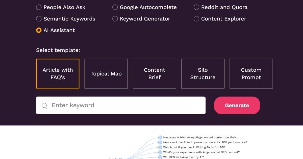 KeywordsPeopleUse is a modern approach to keyword research and content planning, with deep insights into what queries people are typing into search engines. The tool uses a neural network to generate keywords and answers to questions. This can help you develop content ideas or produce initial drafts. Ask the AI assistant your SEO, keyword, and content-related questions using natural language. It responds with helpful answers that add an invaluable layer of assistance—enabling marketers to generate instant insights based on data-backed responses. KeywordsPeopleUse’s powerful AI algorithms can take your keyword and question data, and automatically group them into topic clusters—making it easy to identify content gaps and themes. The AI can generate entire articles based on the clusters of questions provided, including a summary paragraph and each question’s keyword data. You can generate content briefs and site structures thanks to an AI assistant, which will also aid your content planning by generating topics based on research. The tool includes AI-powered features to enable you to analyze keyword data, prioritize topics, and make recommendations.