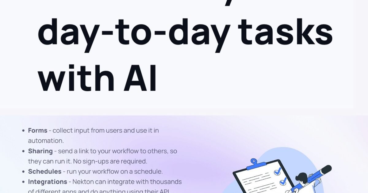 - Automate your workflow steps without complex tools. Use plain English to describe your workflow and Nekton will produce the automation code for you and run it in the cloud.