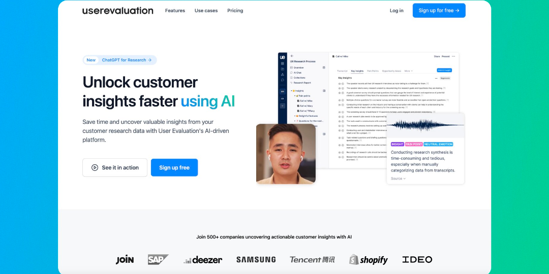 User Evaluation is an AI-Powered UX Research & Usability Testing Platform. Discover new insights from your data, whether it’s audio, video, text, or CSV files. The AI chat experience, similar to ChatGPT, allows you to brainstorm ideas based on customer conversations and retains a record of prior messages for quick reference. With rich text and collaboration tools built right in, sharing your insights has never been faster. User Evaluation transforms AI for UX research and usability testing, so you can do deeper, faster user evaluations. If you’re a UX researcher, product manager or designer looking to use cutting-edge AI evaluation for more insights from user feedback, our full paid AI tool (start with free credits!) has powerful analysis capabilities to supercharge your research workflow. Get Deeper Insights with Intelligent AI Evaluation Understand your user data like you’ve never been able to before. User Evaluation processes a wide range of inputs including audio recordings from usability testing sessions, video feedback capturing user reactions, interview transcripts, open-ended survey text and structured CSV files. The intuitive AI evaluation chat interface, like ChatGPT, lets you ask questions and get answers. Use it to: Dissect User Evaluations: Ask specific questions about your data and get AI generated answers to quickly understand user sentiment and behavior. Pinpoint Usability Issues: Automatically find pain points, moments of confusion or areas of delight in usability testing recordings and transcripts. Brainstorm & Ideate: Use AI to generate hypotheses, explore solutions and develop research questions based on customer conversations and observed behavior. All interactions and insights are saved so you have a persistent knowledge base for your AI for UX research projects for a seamless workflow.