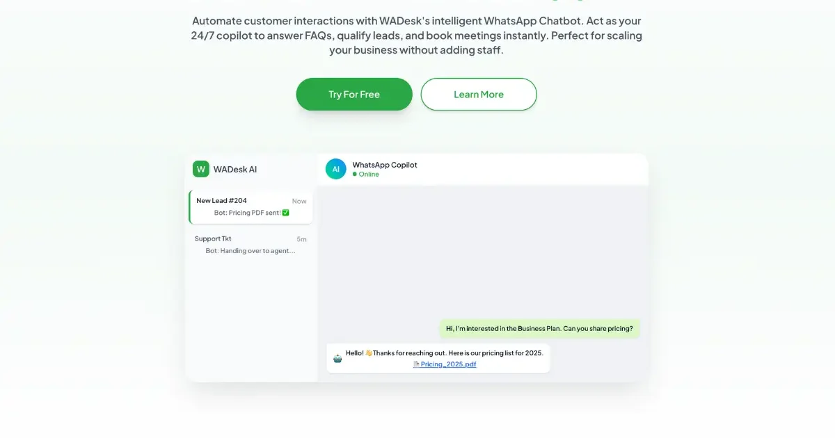WADesk WhatsApp Chatbot is a no- for building AI-powered chatbots that live on WhatsApp. It turns WhatsApp from a simple messaging app into an automated sales and support channel. You connect your WhatsApp Business account, upload your business data or FAQ content, and the bot handles customer conversations automatically. It answers questions, qualifies leads, books appointments, and processes orders without you manually typing responses. The platform integrates with AI models like ChatGPT, Google Gemini, and Claude. You drag and drop to build conversation flows, set up triggers, and route complex issues to human team members when needed. Multi-language support means it translates incoming messages and routes them intelligently across teams. The setup is built for people who hate coding. You use a drag and drop builder to design workflows, such as qualifying a lead before it ever hits your inbox or routing complex technical issues to a human. One of its better features is the automated translation. If you are selling globally, the bot can translate incoming messages and your replies in real time, which is a massive help for teams working across borders. This is built for business owners and indie hackers operating in WhatsApp-heavy markets (Southeast Asia, Latin America, Africa, parts of Europe). E-commerce sellers use it for cart abandonment and order tracking. Real estate agents send virtual property details. Agencies deploy it for client lead qualification. Solo founders and small teams use it to handle support volume that would otherwise require hiring. You don’t need developers or coding experience. The setup takes minutes if you have your business basics ready (FAQ, products, contact info). No–and-drop builder for creating conversation flows and automated responses Integration with ChatGPT, Google Gemini, and Claude for natural language understanding Knowledge base training so the bot learns your specific business details Lead qualification and sales funnel automation directly in WhatsApp CRM syncing with tools like HubSpot and Zapier, plus Google Sheets integration Multi-language support with automatic message translation Smart routing to human agents for complex conversations Real-time dashboard monitoring of all bot conversations Stripe and payment gateway integration for transactional workflows WhatsApp Business API compliance built in 24/7 operation without agent presence